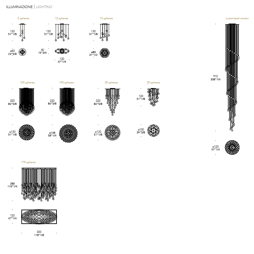 Chandelier with painted glass support in white or black lacquered or mirror finish, provided with 5, 12, 25, 50, 105 or 153 spheres in blown glass in smooth or "à torchon" finish. The spheres are available also in colored blown glass. Equipped with halogen bulbs inside or LED.