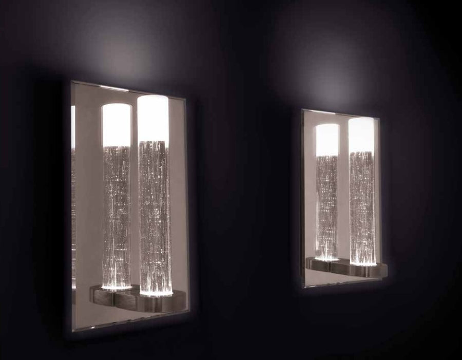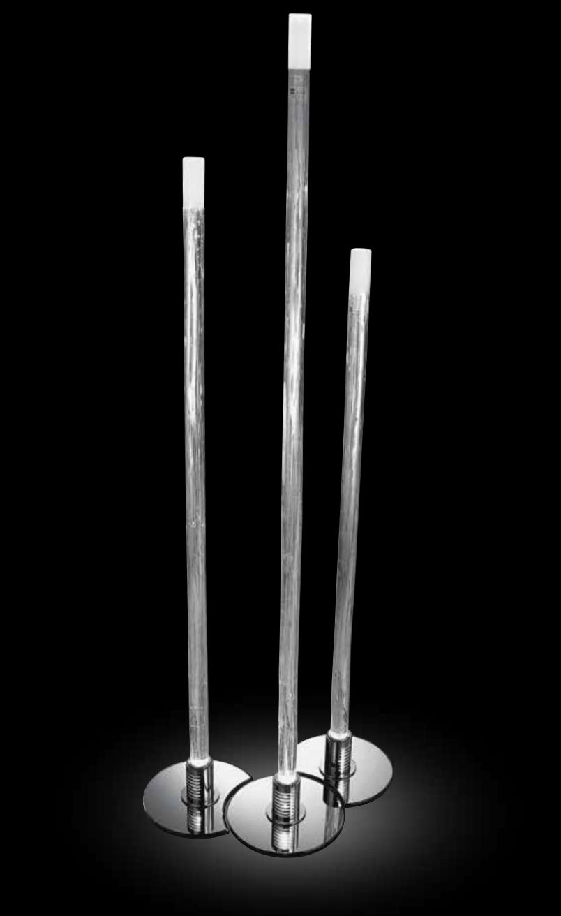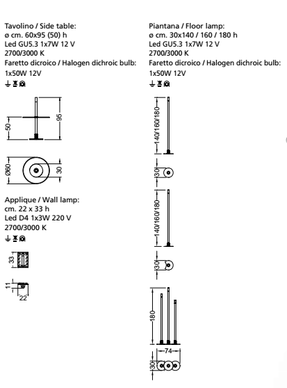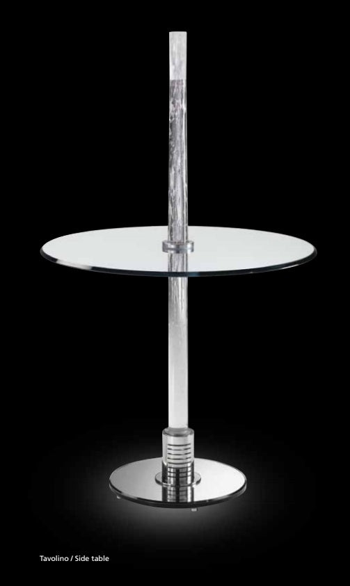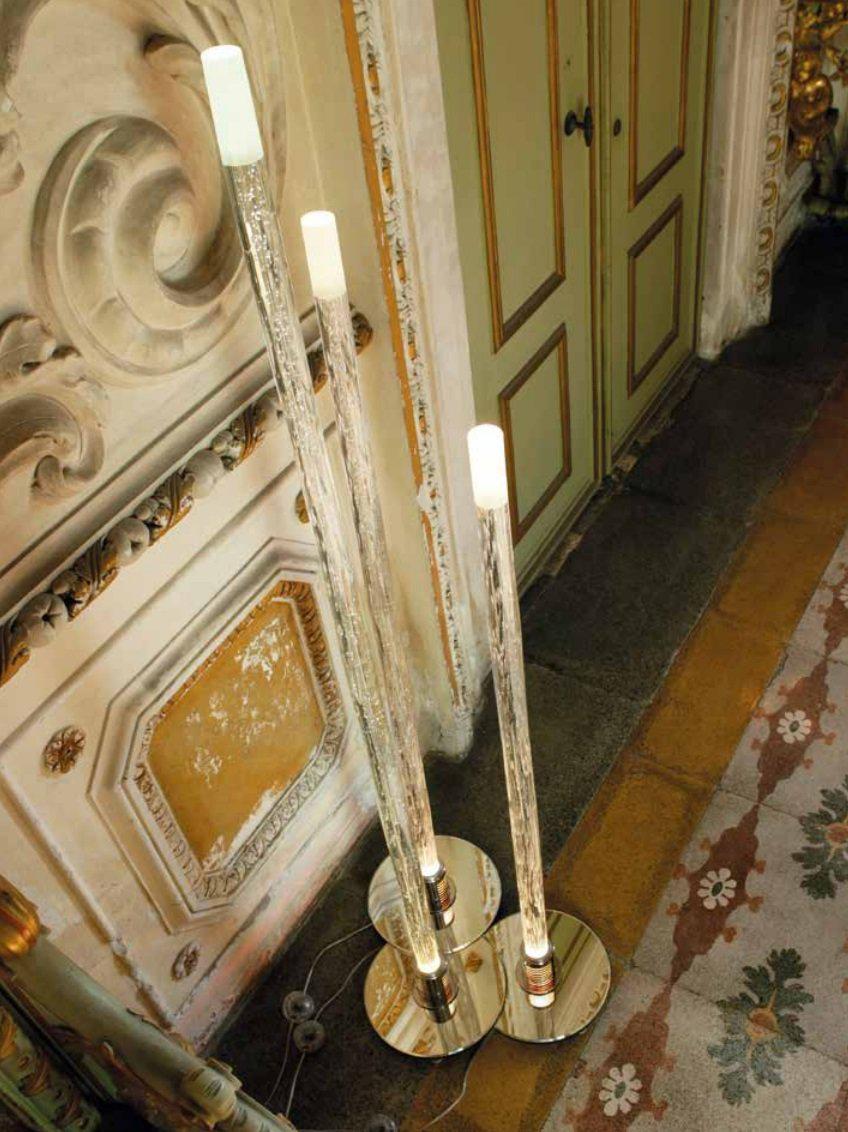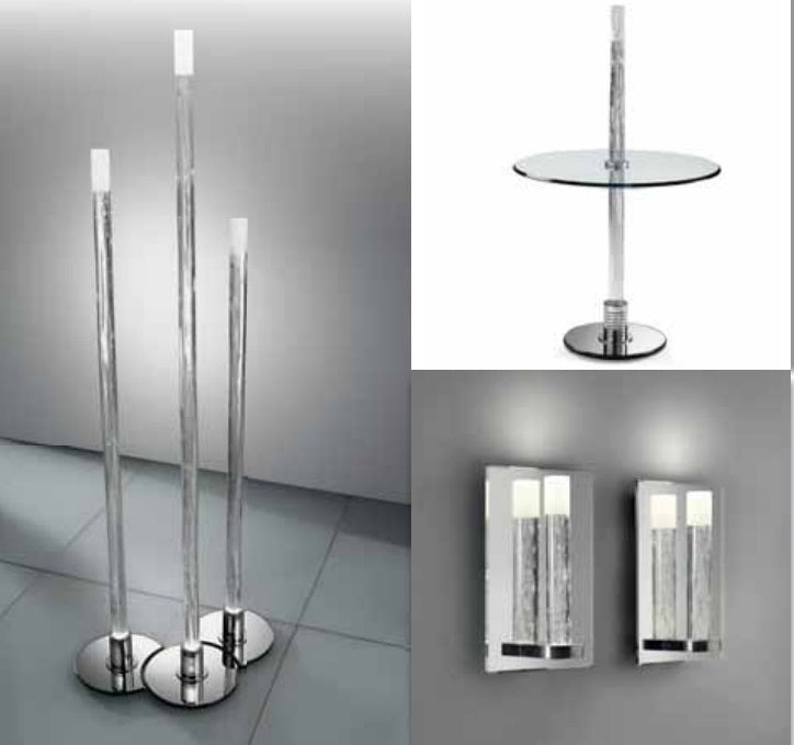 Floor lamps, wall lamp and side table with central rod in handmade Murano glass frosted on the top. Table with round mirror base and lamps with round or half-moon-shaped mirror base. Equipped with dichroic halogen bulb 50W located below.