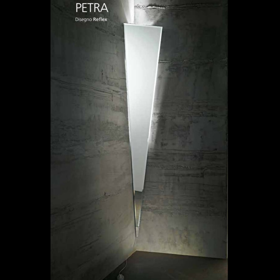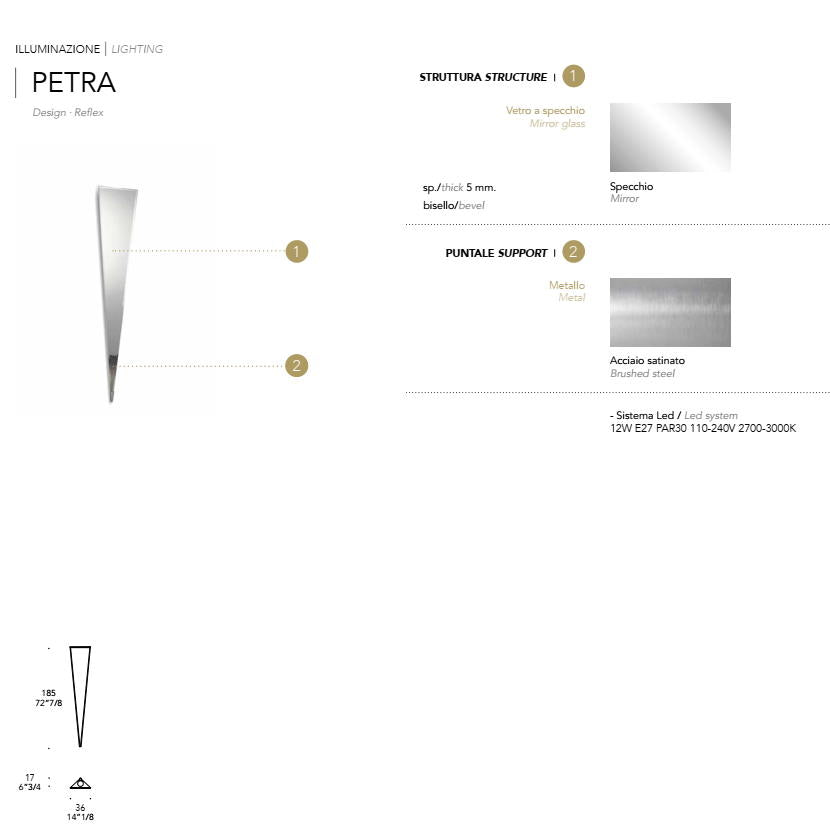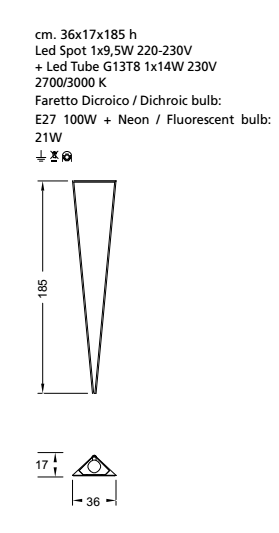Corner wall lamp in beveled mirror, 5mm thick. Equipped with one dichroic halogenbulb (100W) and one fluorescent bulb(21W).