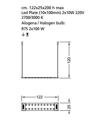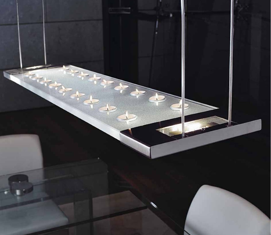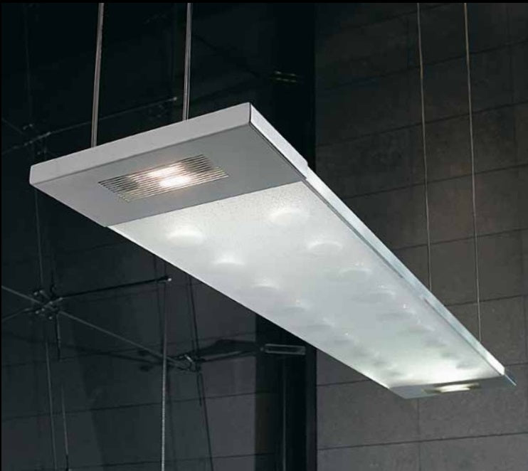 Pendant lamp in extra-clear bush hammered 19mm thick with candle holder. Frame in inox-steel and rectangular ceiling connection's plate in glass. Equipped with halogen bulbs 100W.