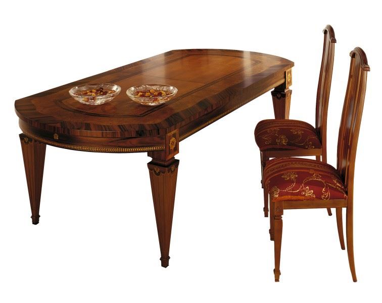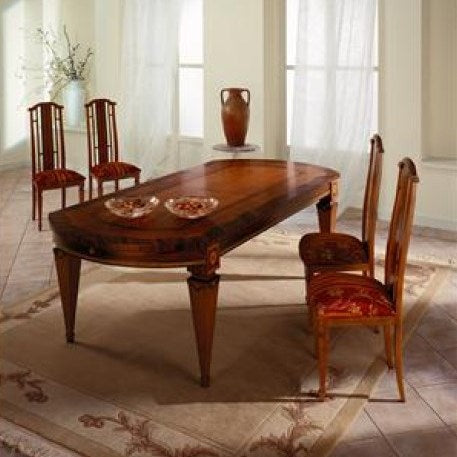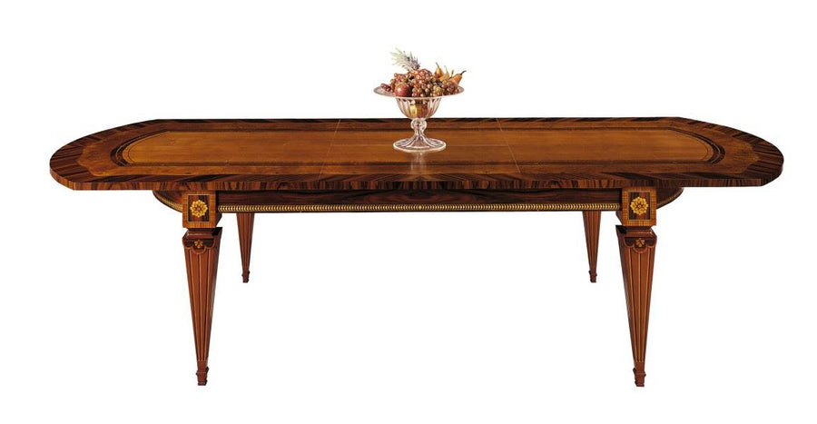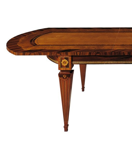A large, marvellous table in solid wood structure plated in palisander, myrtle and walnut with rich inlaid filletings.