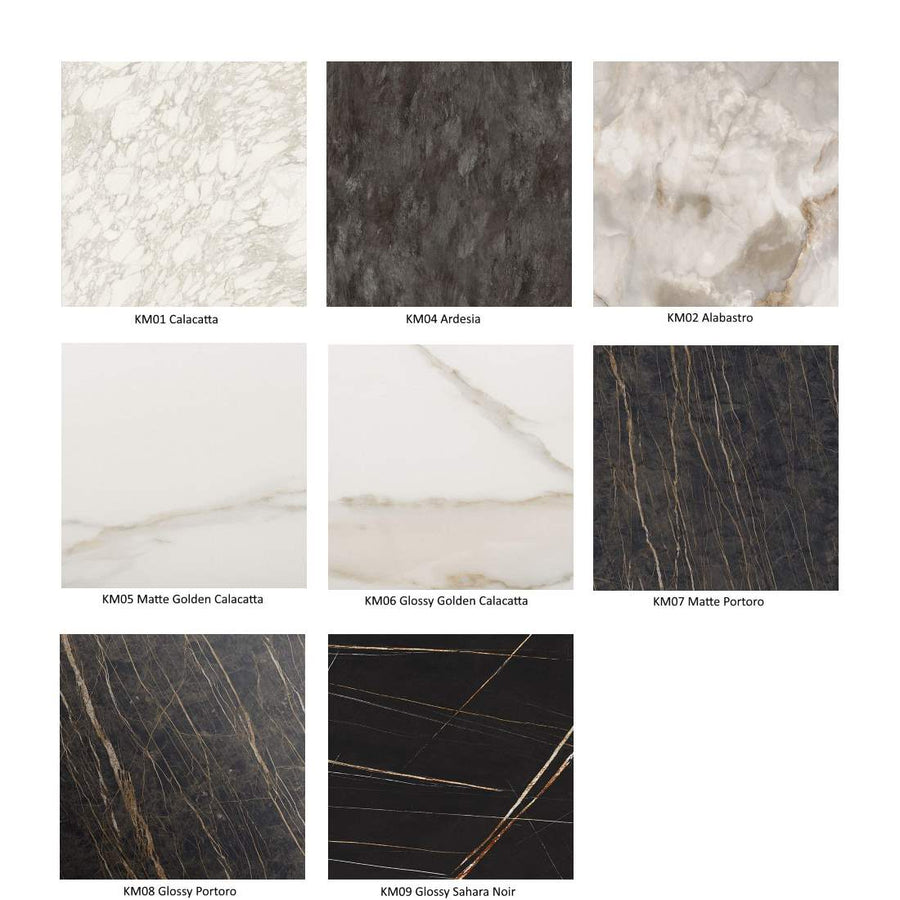 Top in ceramic Marmi Calacatta (KM01), Alabastro (KM02), Ardesia (KM04), matt Golden Calacatta (KM05), glossy Golden Calacatta (KM06), matt Portoro (KM07), glossy Portoro (KM08), glossy Sahara Noir (KM09) or Brown Zinc (KZ01).