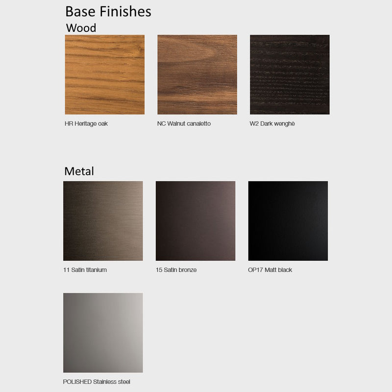 Table with base in matt white (OP71), black (OP17) or graphite (OP69) painted steel, or in wheatered brass or polished stainless steel, or in satin bronze (15), satin titanium (11) painted steel, or with wooden base in Canaletto walnut (NC), dark Wenghè (W2) or Heritage oak (HR).