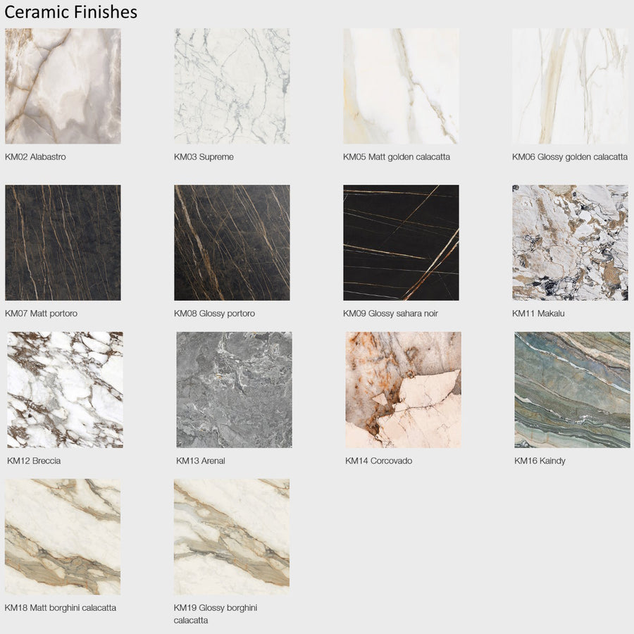 Laying top in ceramic Marmi Calacatta (KM01), Alabastro (KM02), Ardesia (KM04), matt Golden Calacatta (KM05), glossy Golden Calacatta (KM06), matt Portoro (KM07), glossy Portoro (KM08), glossy Sahara Noir (KM09) or Brown Zinc (KZ01) ceramic top.