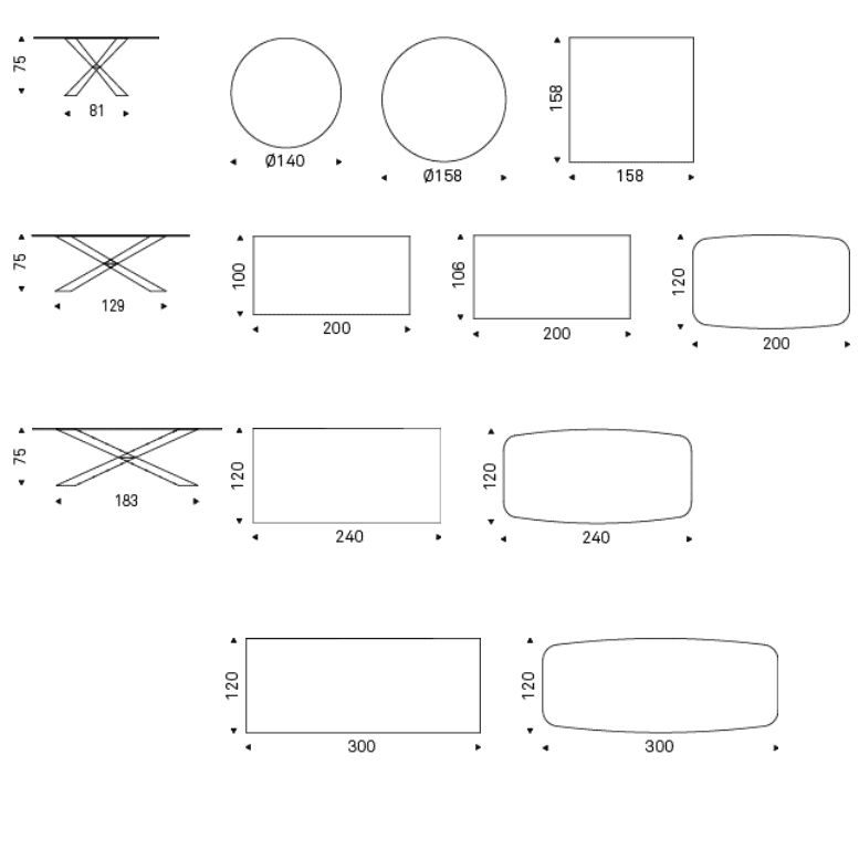 | sag. 8 | 78 3/4" (200 cm) | 47 1/4" (120 cm) | 29 1/2" (75 cm) |