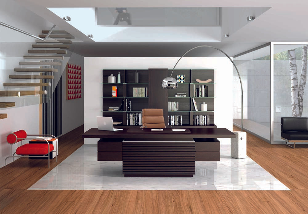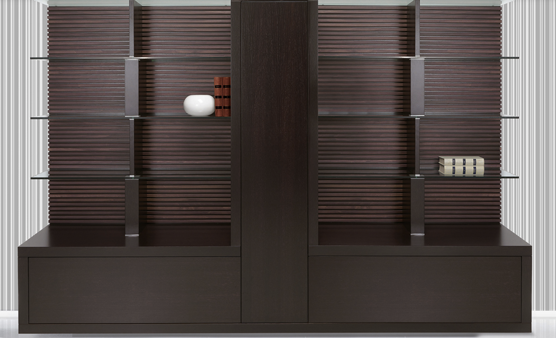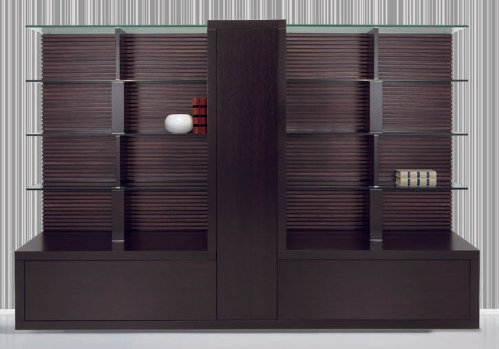 Made to store garments, it ensures a neat and uncluttered office. The side storage units with tilting doors, provide ample and easily accessible filing space. A large, open area is filled with solid glass shelves, ideal for precious volumes or personal souvenirs.