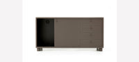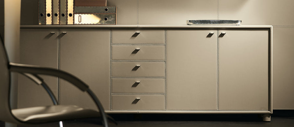 The Verona Credenza features doors and drawers in wood or leather doors or a combination of wood and leather with soft closing drawers.