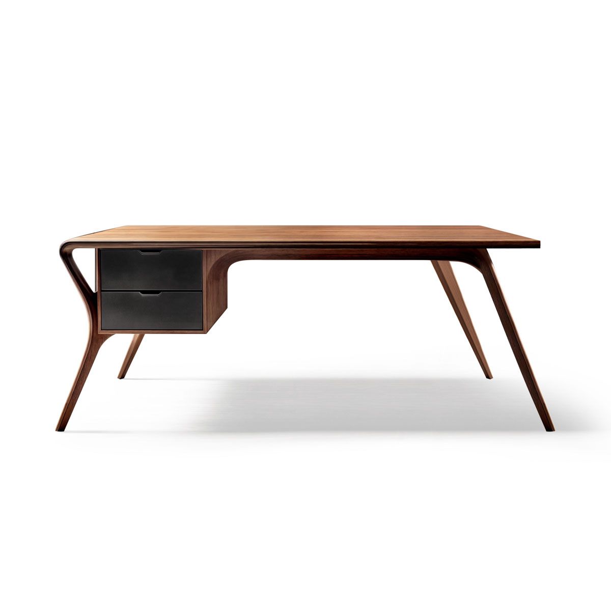 Top & structure of the drawers in veneer Venice, legs in solid wood Noce Canaletto, frontal panels of drawers in leather art. Daino col. Coal